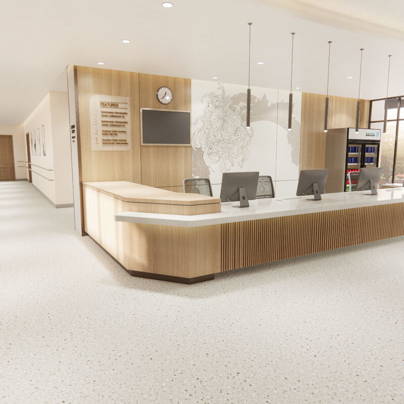 স্বাস্থ্যকর গ্রাউট-মুক্ত নার্সিং হোম ফ্লোরিং: স্টোন-লুক মাল্টি লেয়ার এলভিটি 1