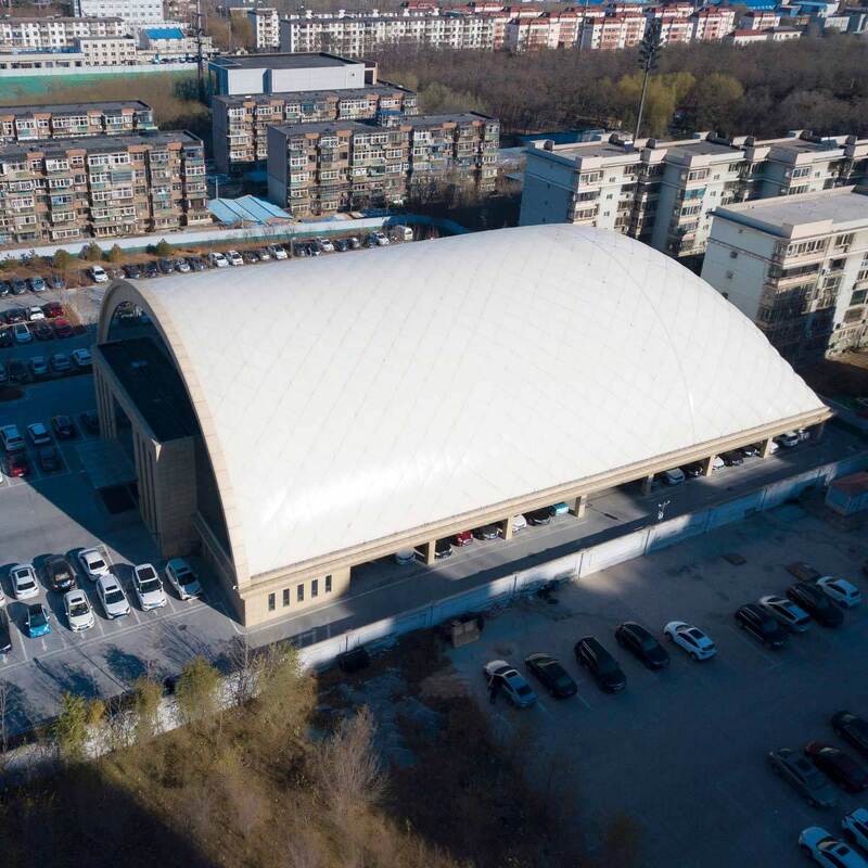 This PVDF building membrane has standard thicknesses 1.0mm to 1.03mm, widths 1000mm to 1800mm and lengths 50m 100m. Customizable colors are offered. It boasts excellent weather UV resistance self cleaning high strength flame retardancy and heat insulation, and is workable for stadium roof wall and tension membrane structure.